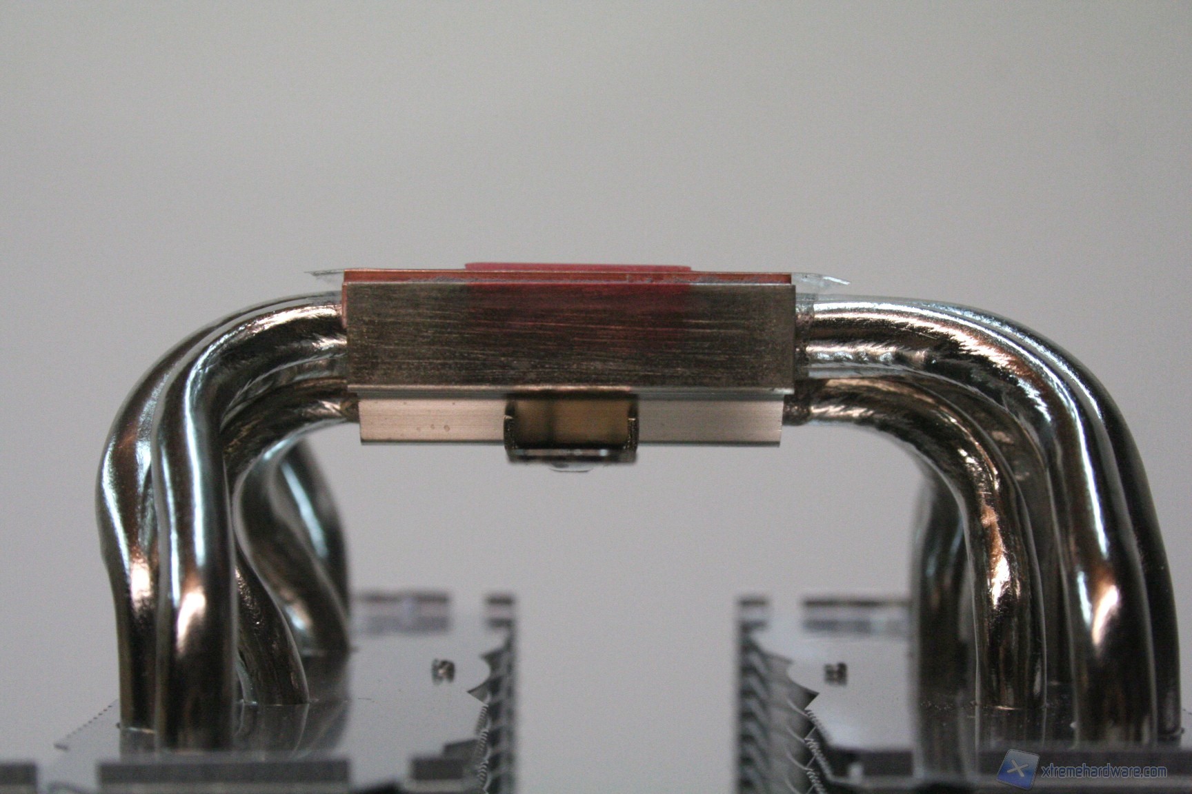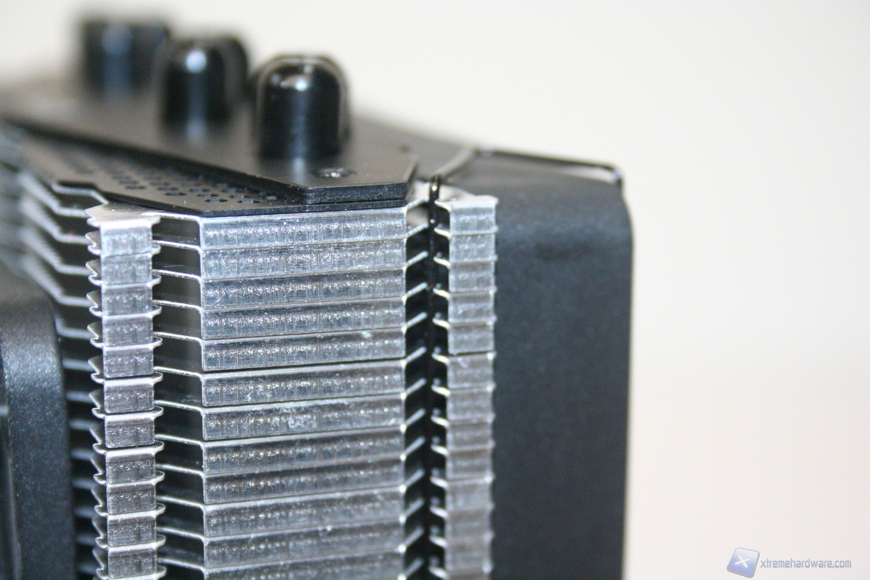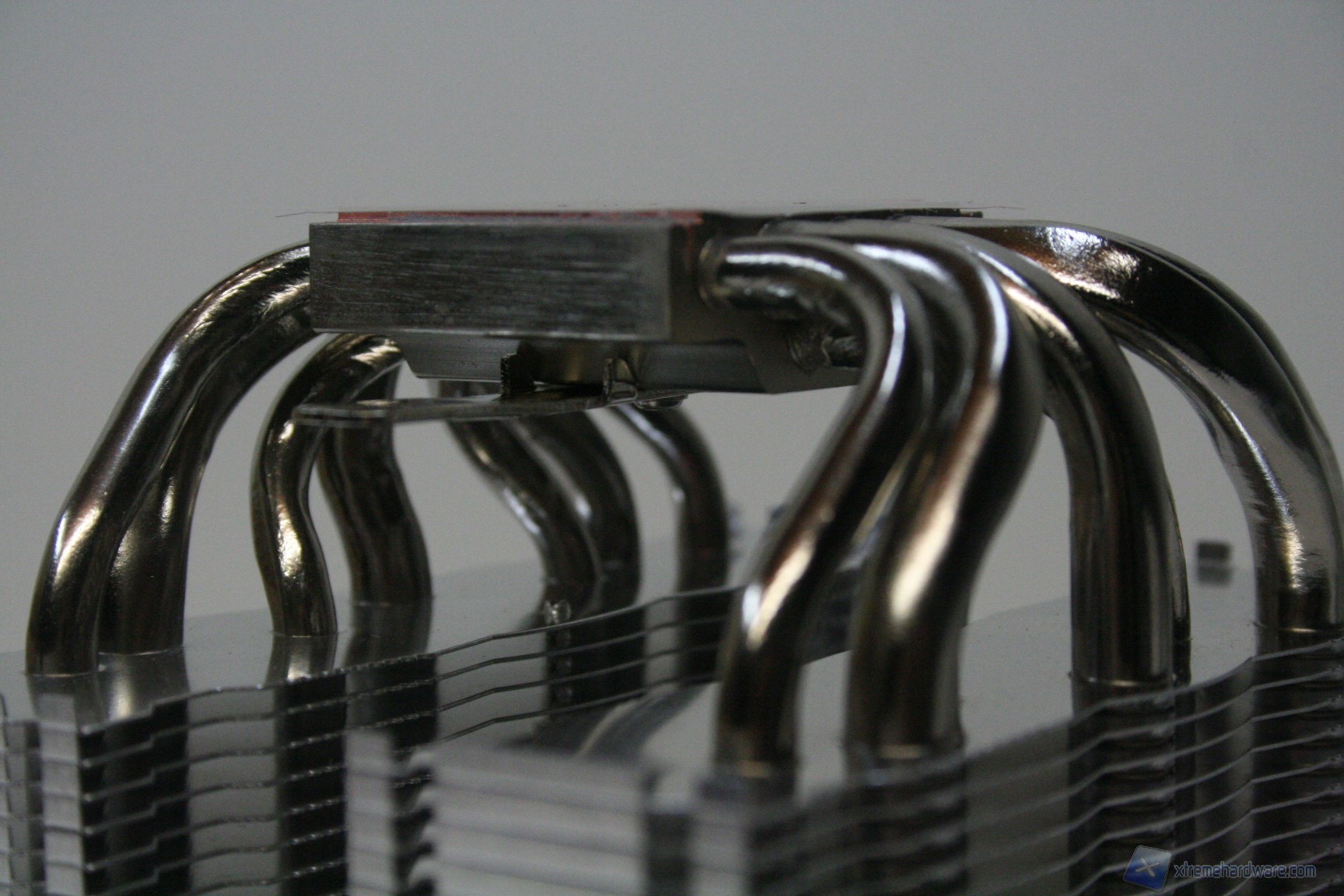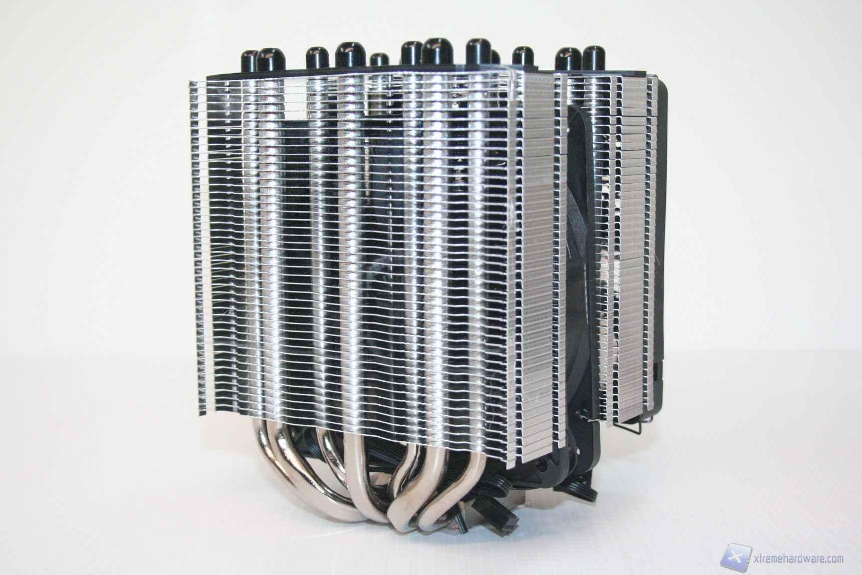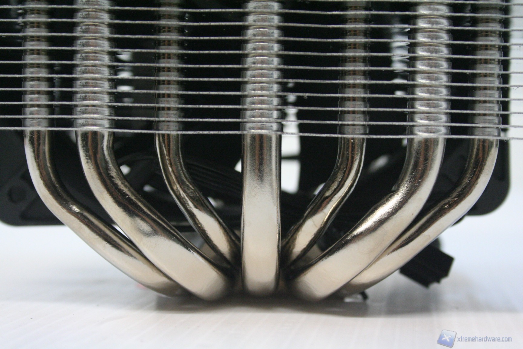 La struttura fa parte della classica tipologia a doppia torre di raffreddamento, costituita da due corpi dissipanti attraversati però da un numero molto elevato di alette, addirittura 7, strutturate a “U” e ottimamente distribuite sull’intero volume. La particolarità di questo modello e della ripartizione delle heatpipes può essere evinta dalla fotografia seguente; precisiamo che è un pattern già visto sul modello, da noi recensito, Gelid GX-7: