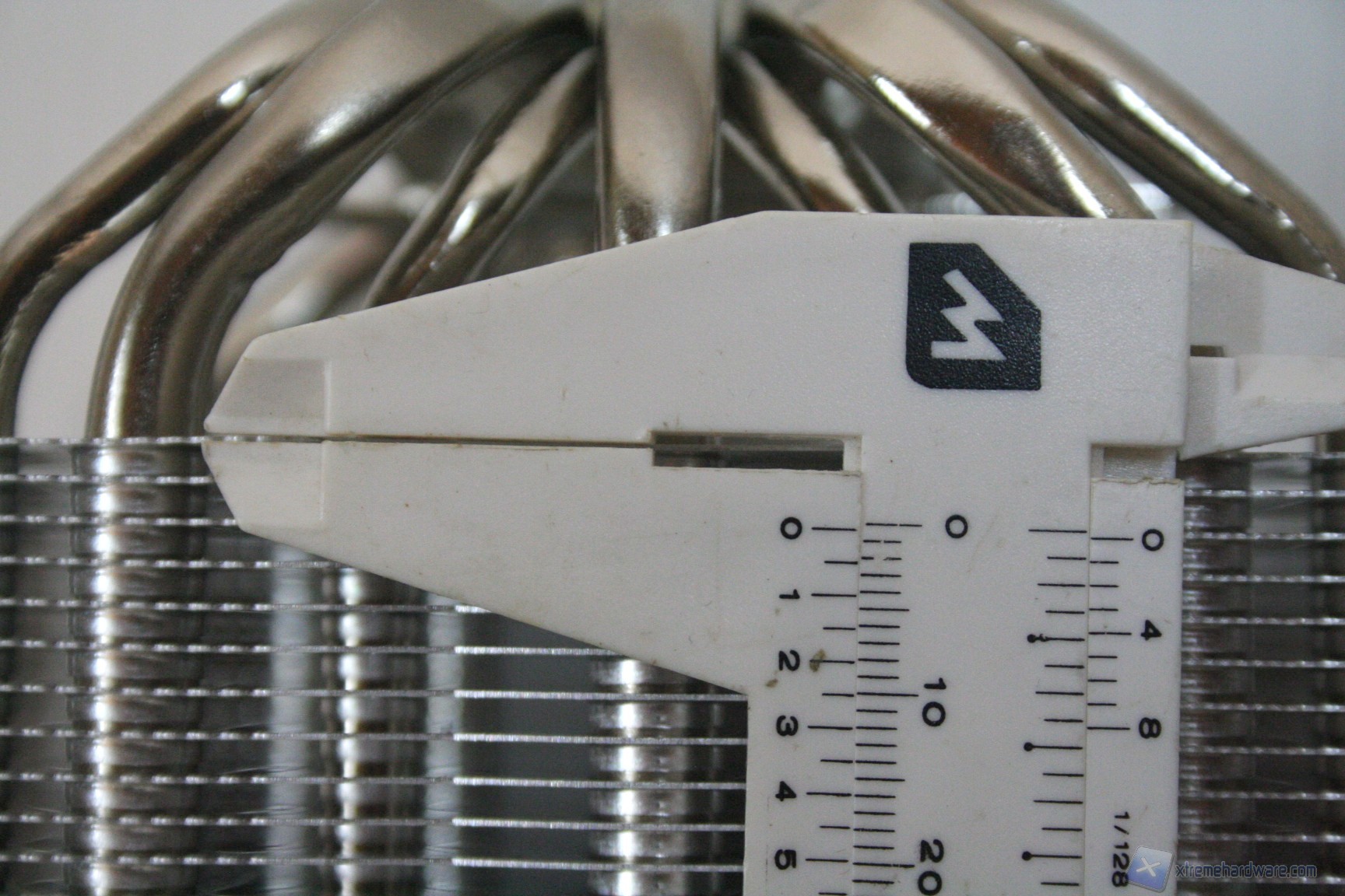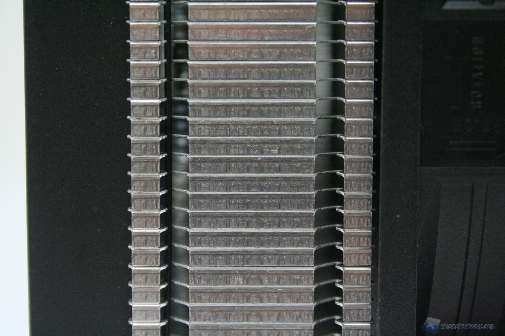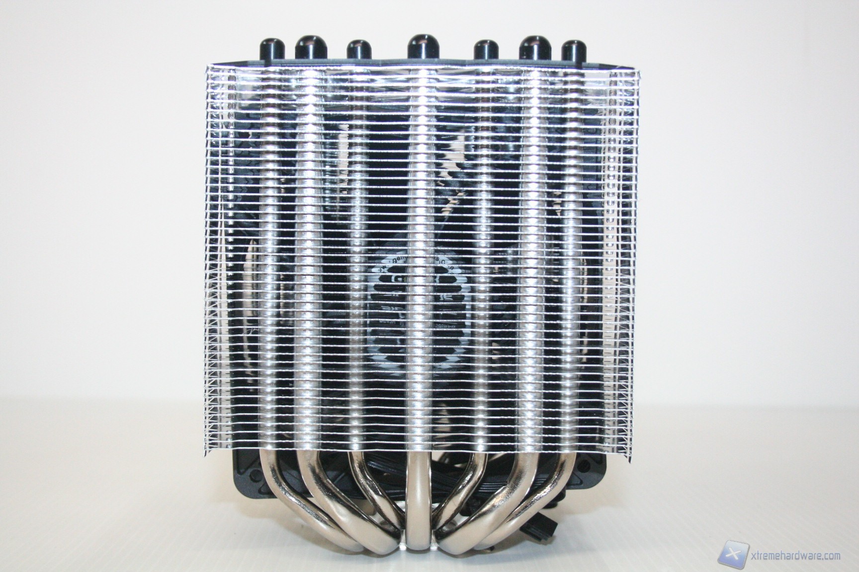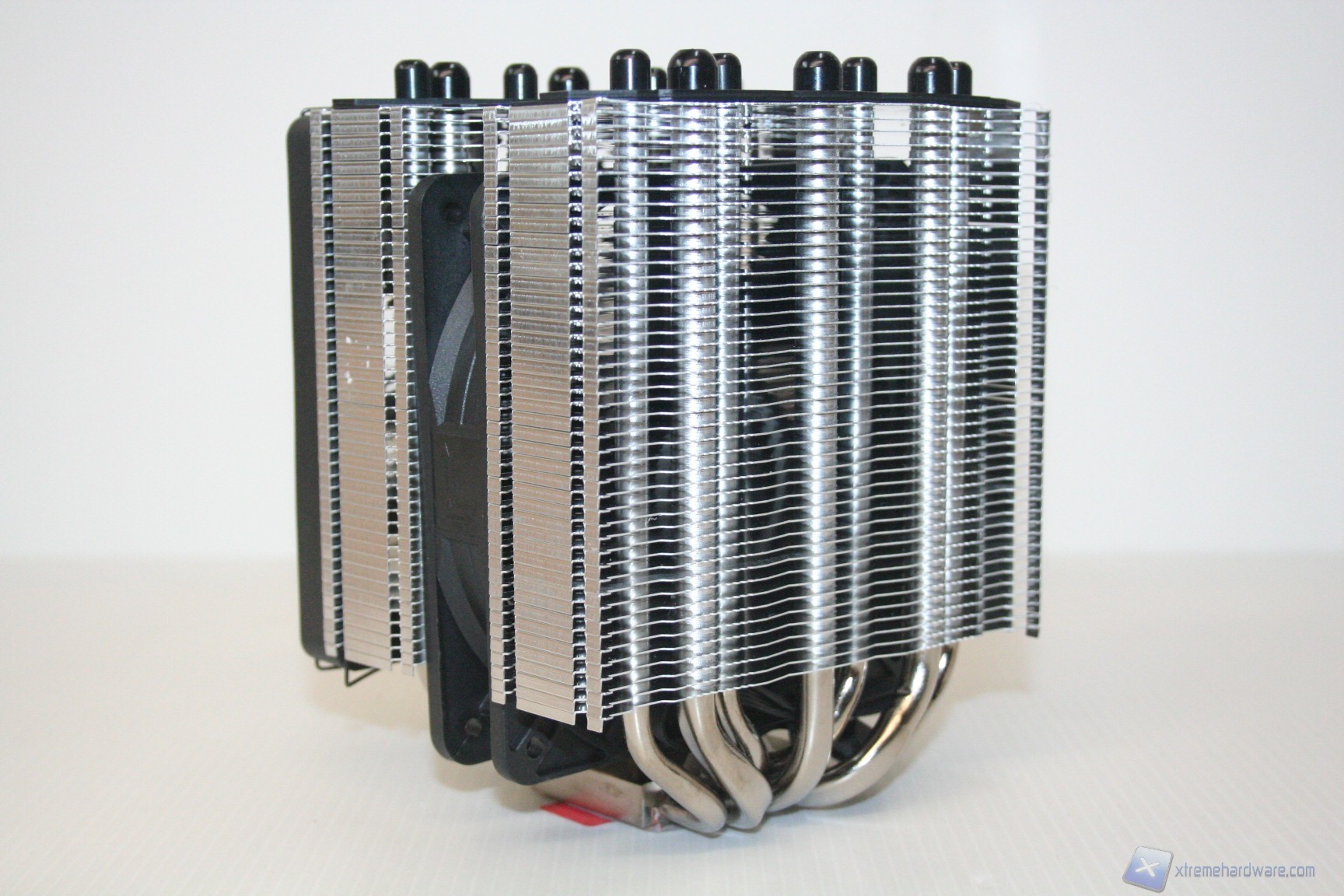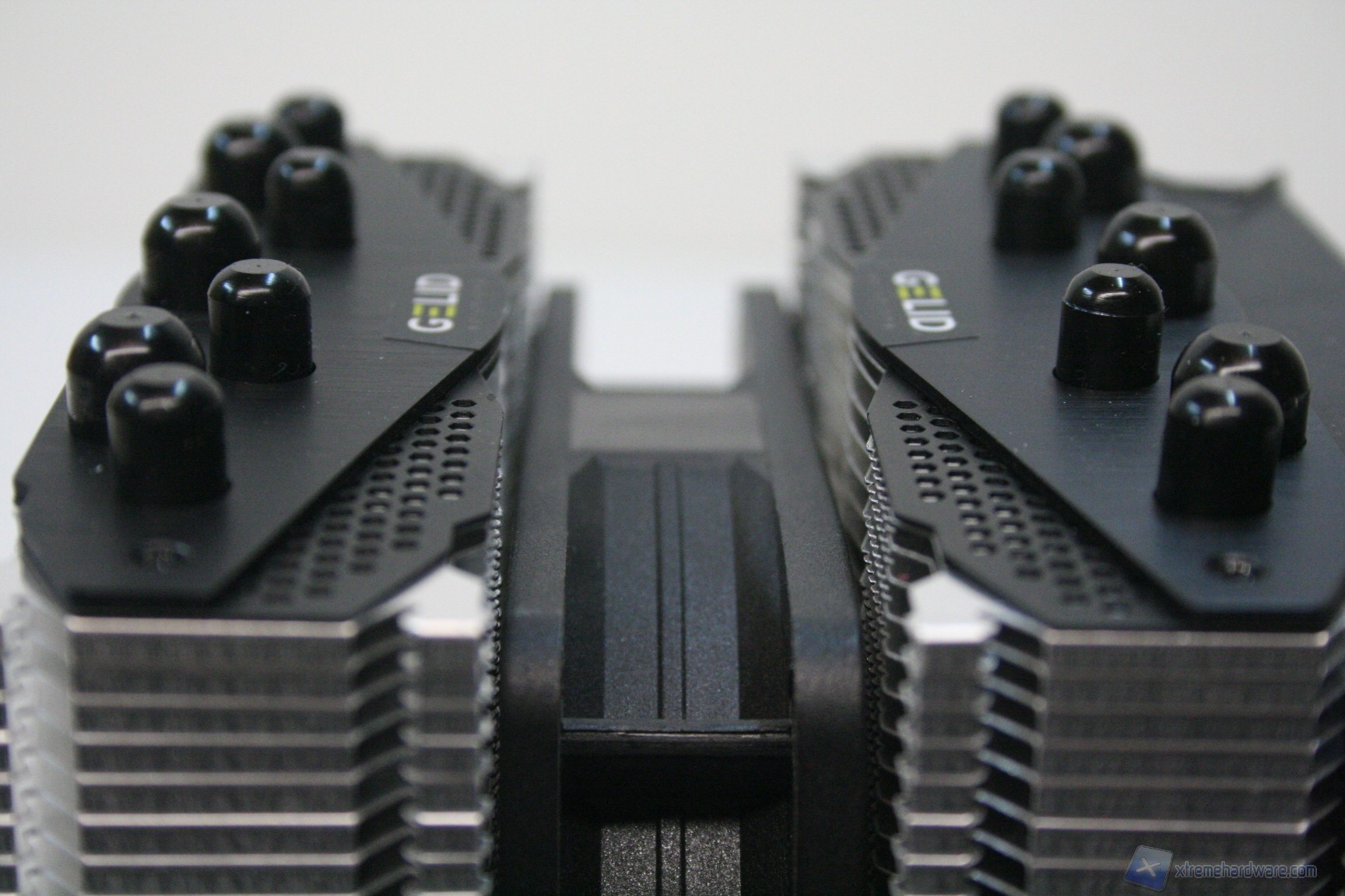 La struttura fa parte della classica tipologia a doppia torre di raffreddamento, costituita da due corpi dissipanti attraversati però da un numero molto elevato di alette, addirittura 7, strutturate a “U” e ottimamente distribuite sull’intero volume. La particolarità di questo modello e della ripartizione delle heatpipes può essere evinta dalla fotografia seguente; precisiamo che è un pattern già visto sul modello, da noi recensito, Gelid GX-7: