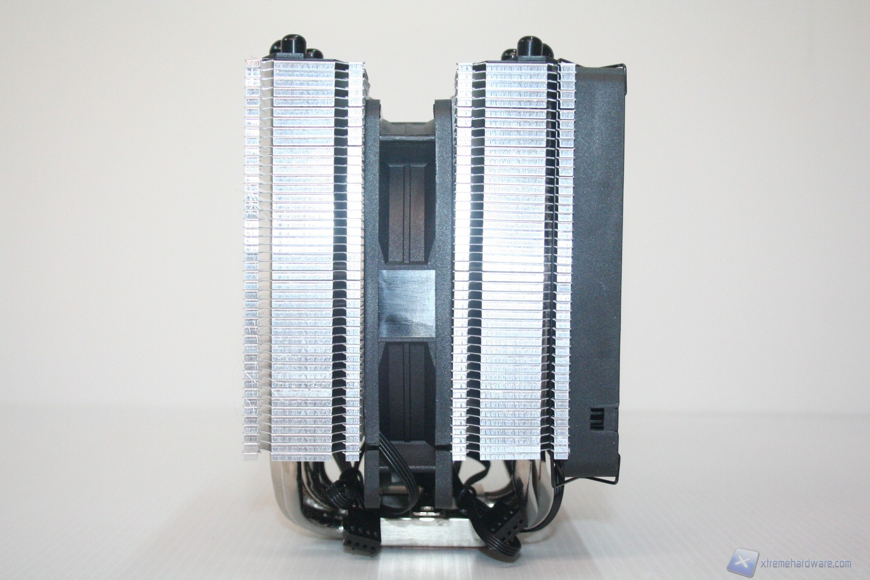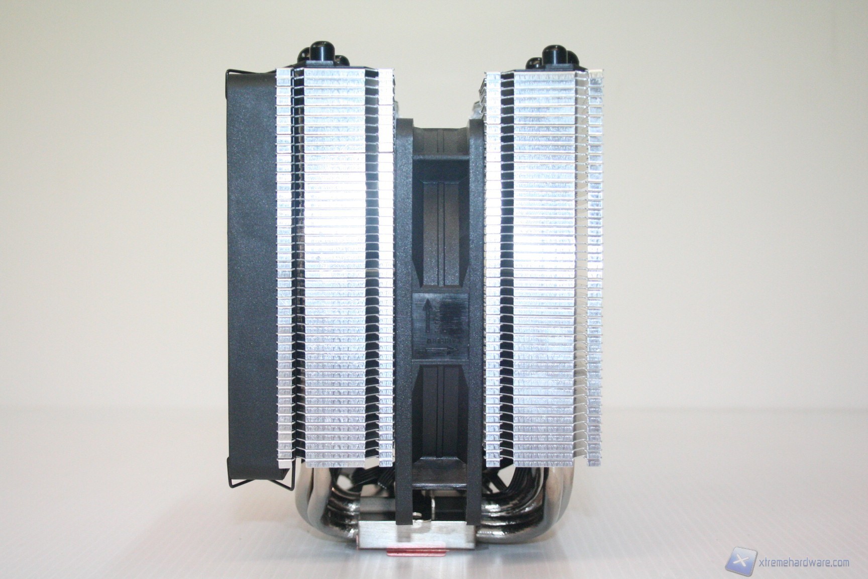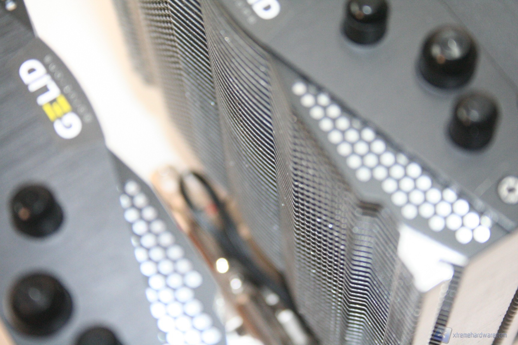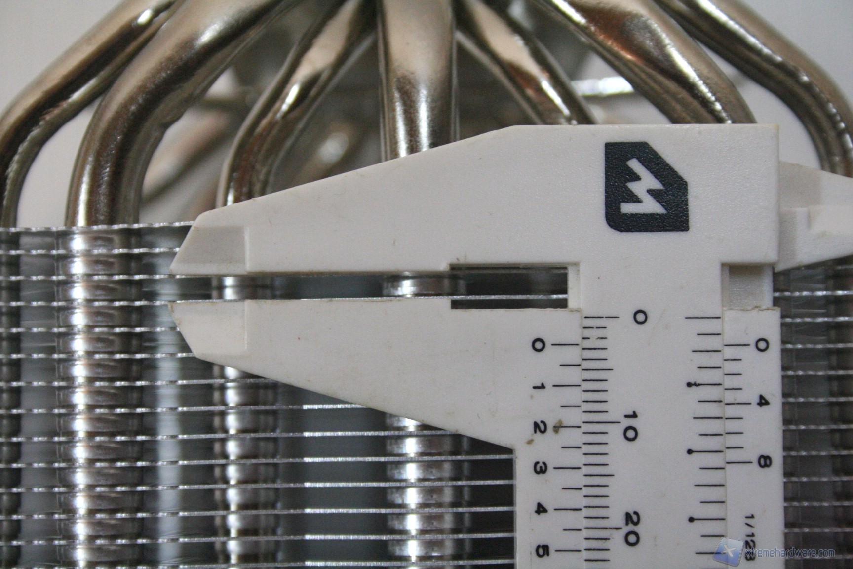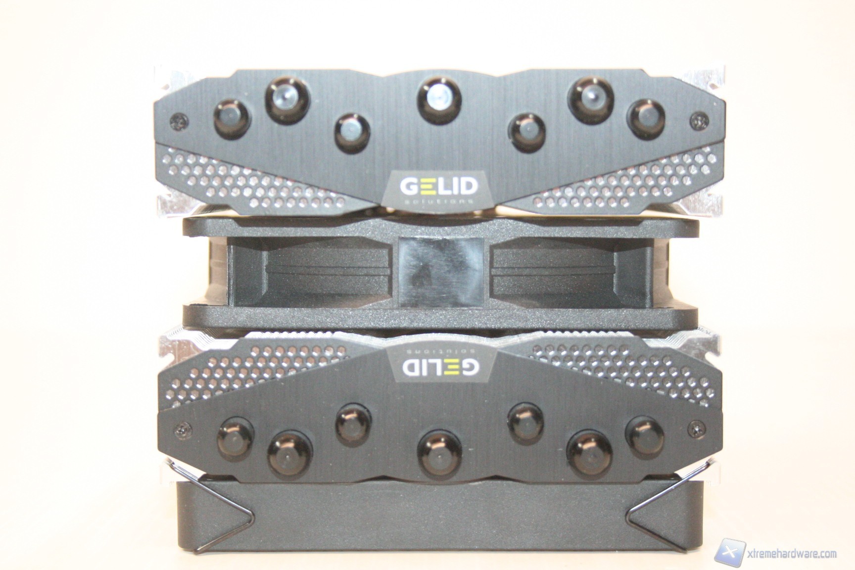 La struttura fa parte della classica tipologia a doppia torre di raffreddamento, costituita da due corpi dissipanti attraversati però da un numero molto elevato di alette, addirittura 7, strutturate a “U” e ottimamente distribuite sull’intero volume. La particolarità di questo modello e della ripartizione delle heatpipes può essere evinta dalla fotografia seguente; precisiamo che è un pattern già visto sul modello, da noi recensito, Gelid GX-7: