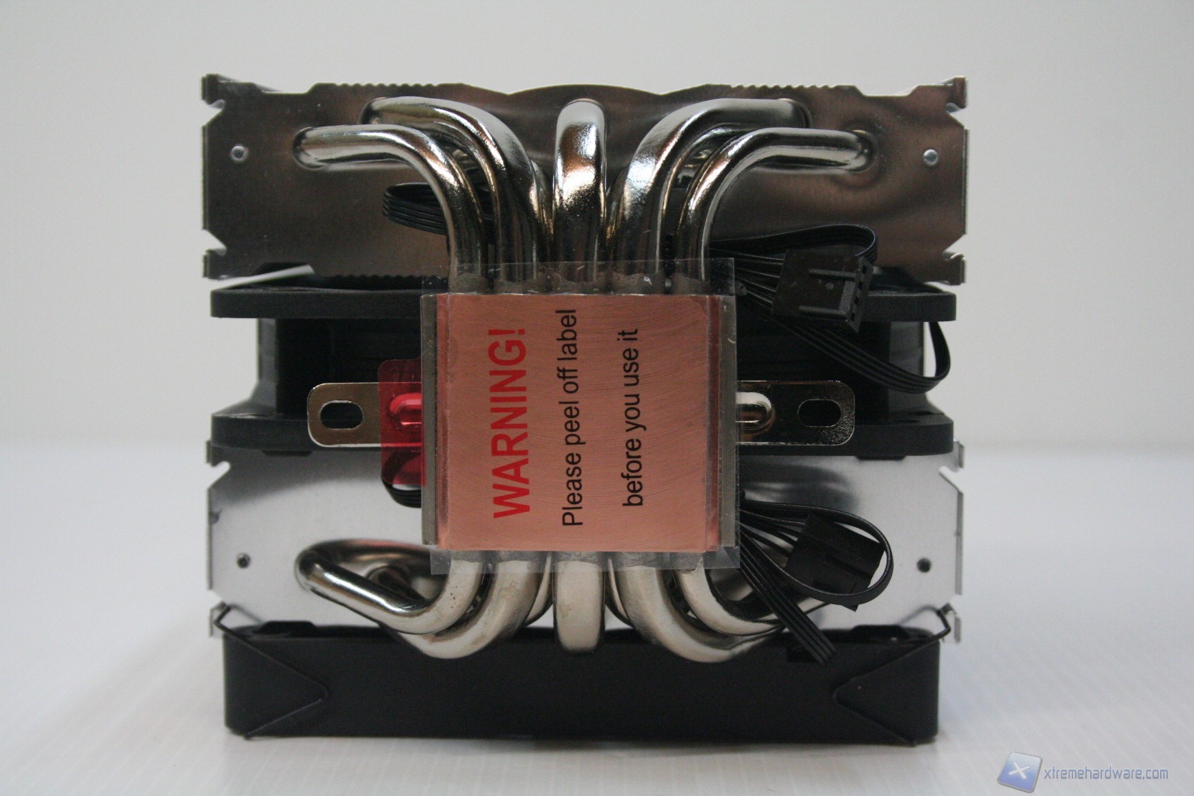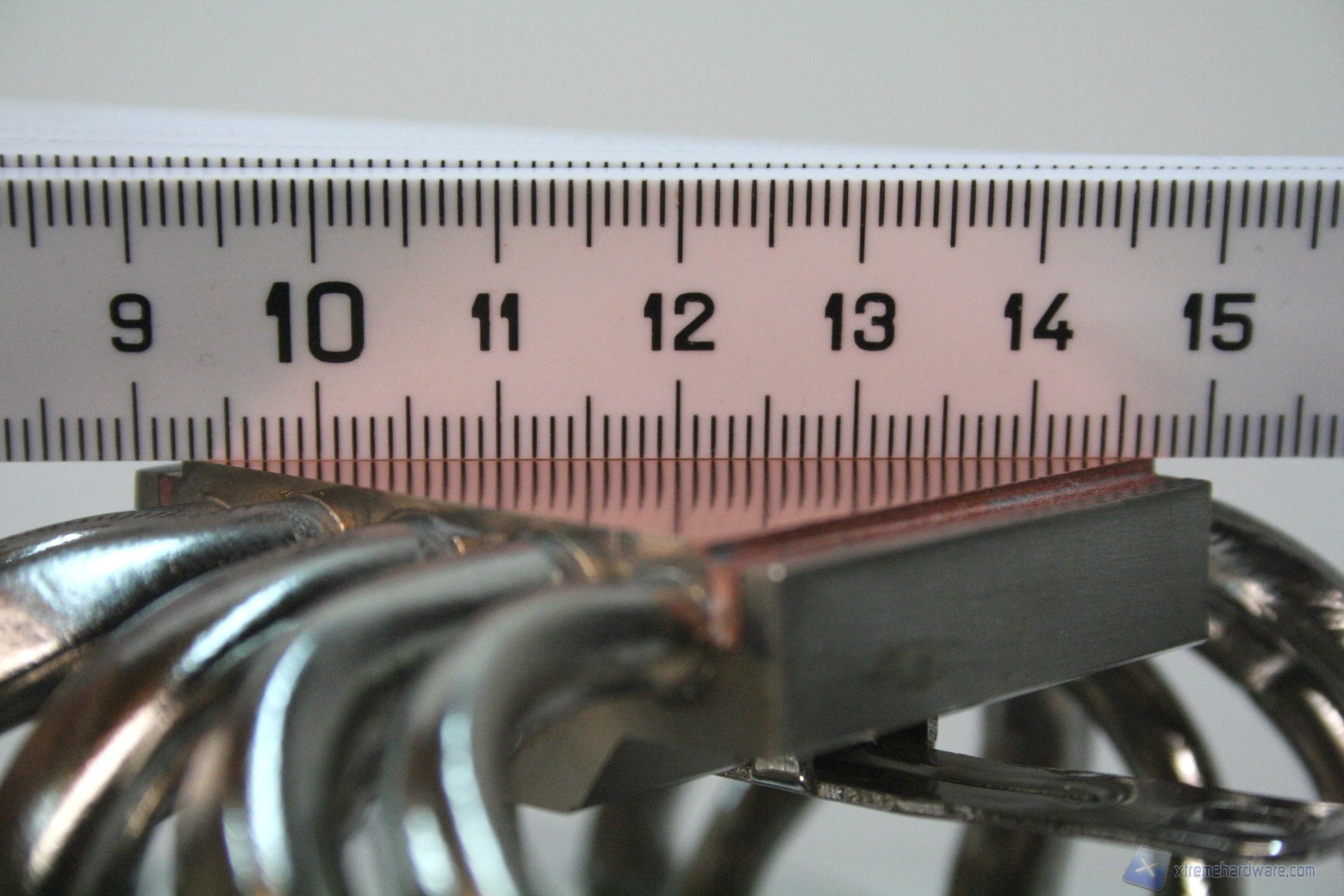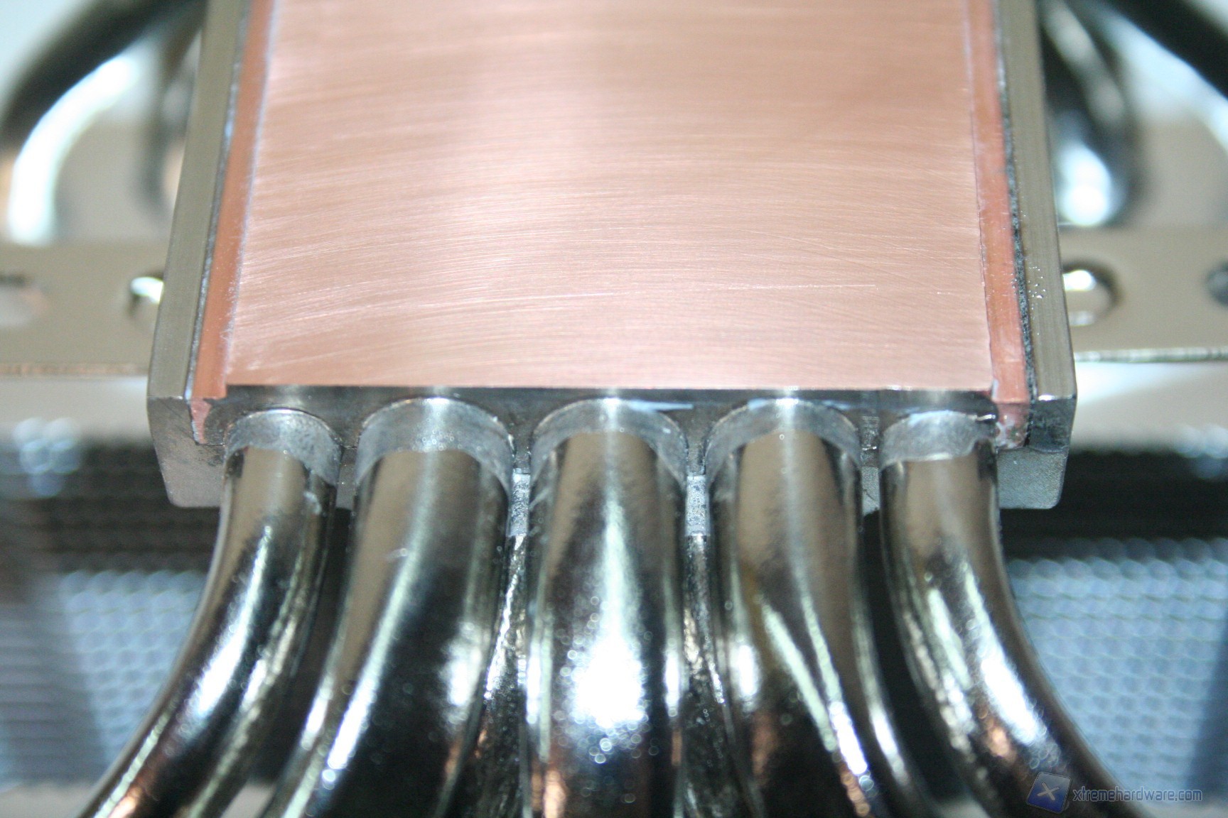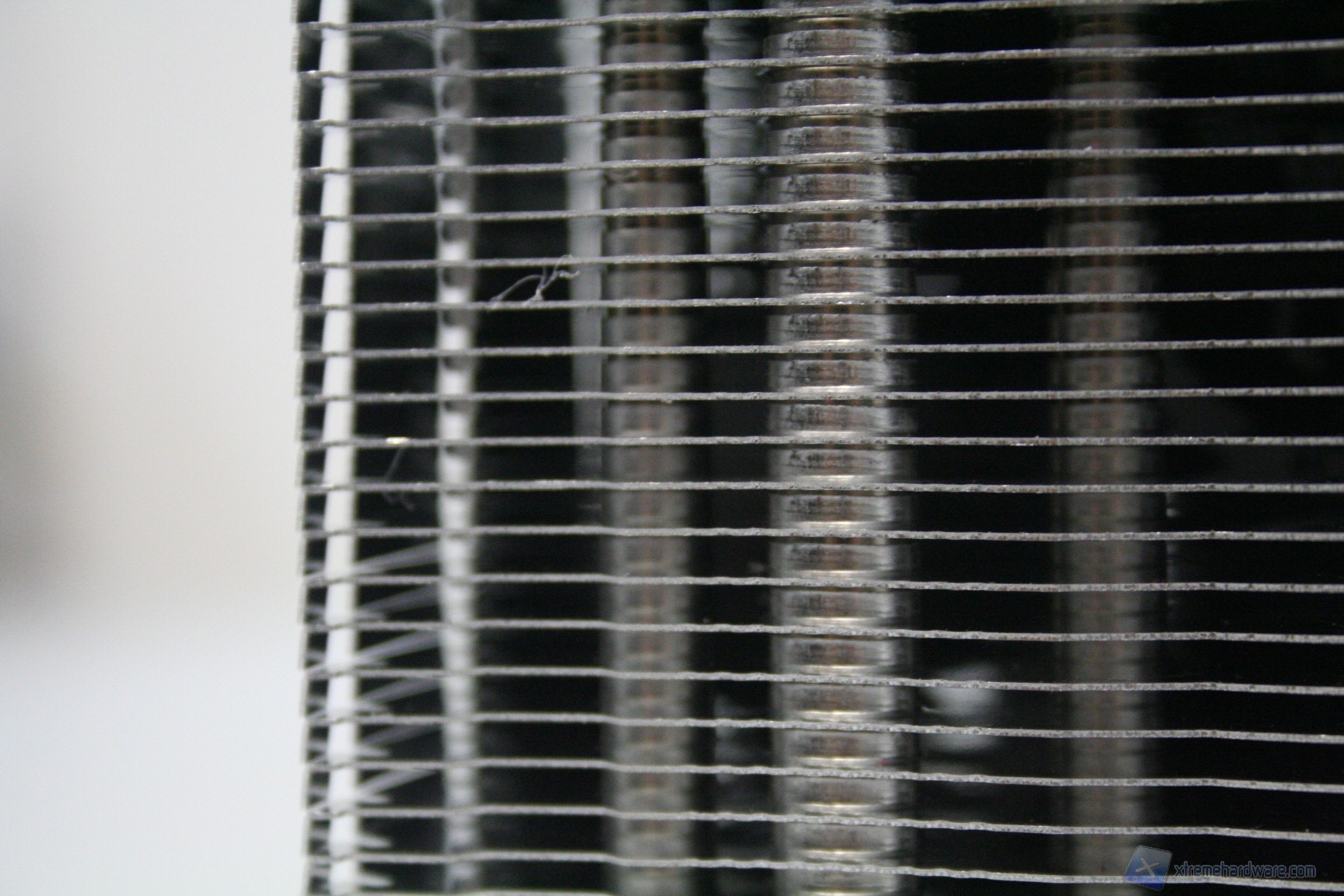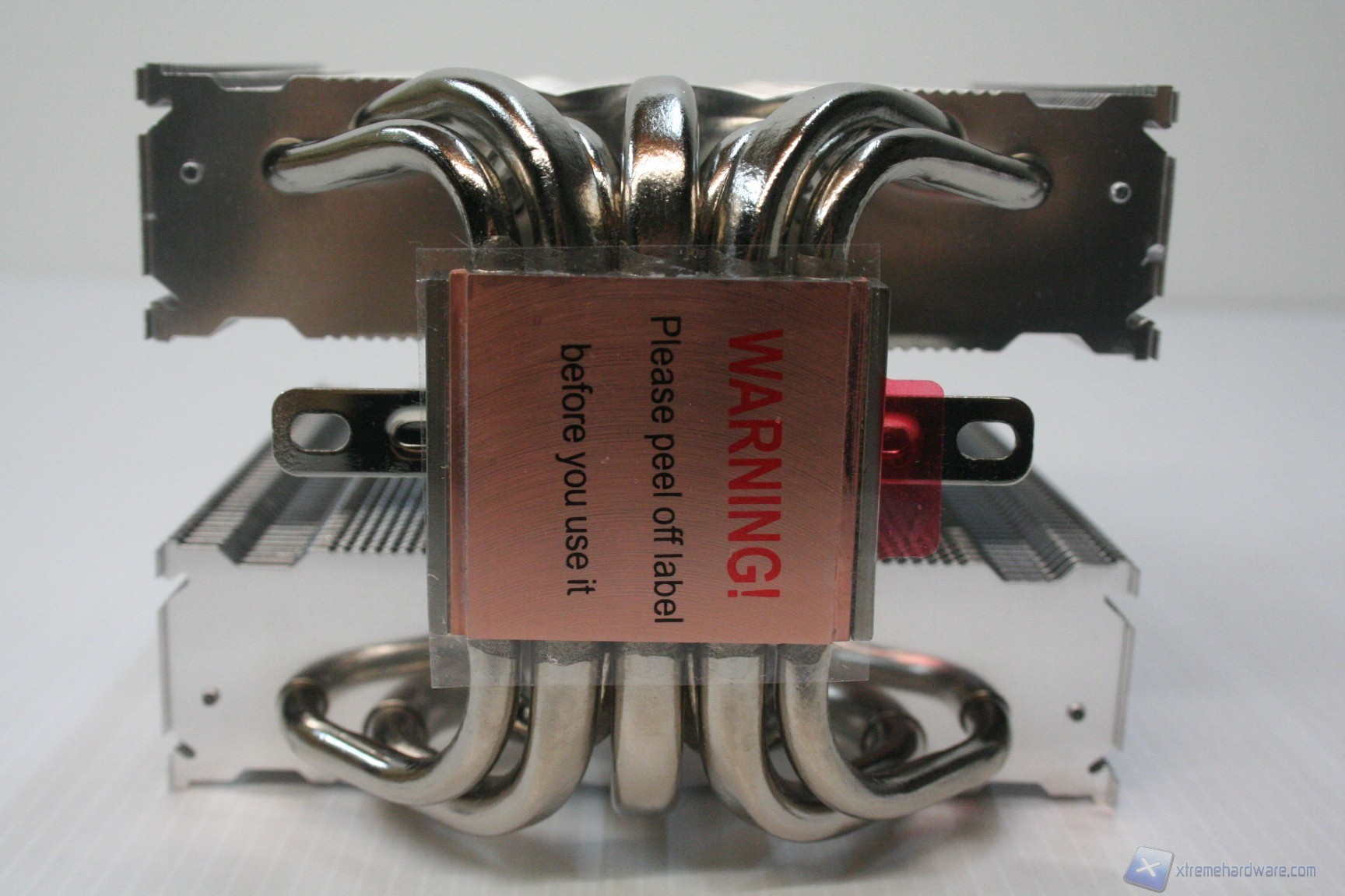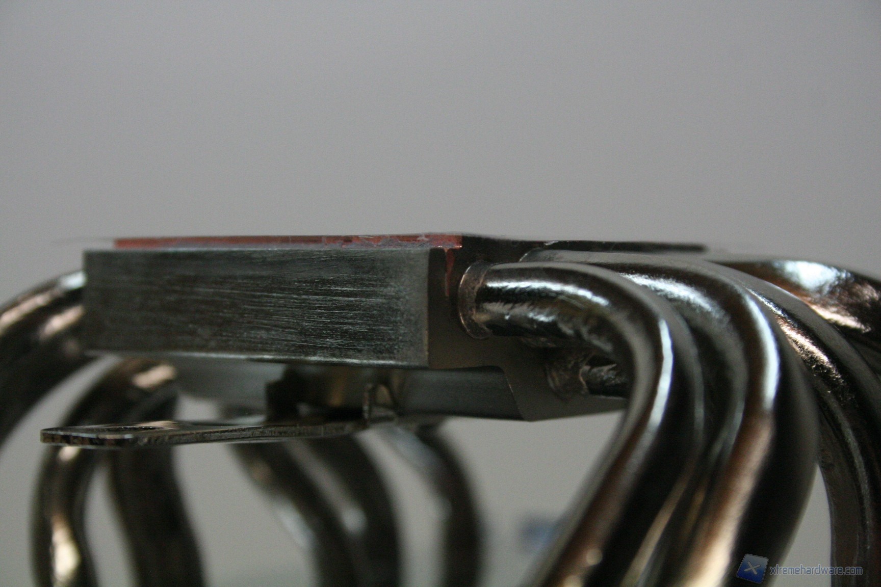 La struttura fa parte della classica tipologia a doppia torre di raffreddamento, costituita da due corpi dissipanti attraversati però da un numero molto elevato di alette, addirittura 7, strutturate a “U” e ottimamente distribuite sull’intero volume. La particolarità di questo modello e della ripartizione delle heatpipes può essere evinta dalla fotografia seguente; precisiamo che è un pattern già visto sul modello, da noi recensito, Gelid GX-7: