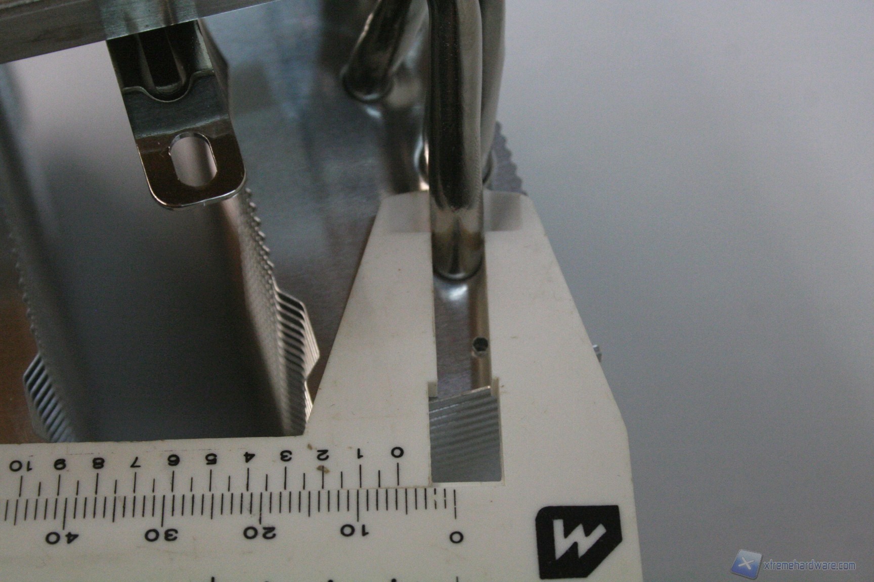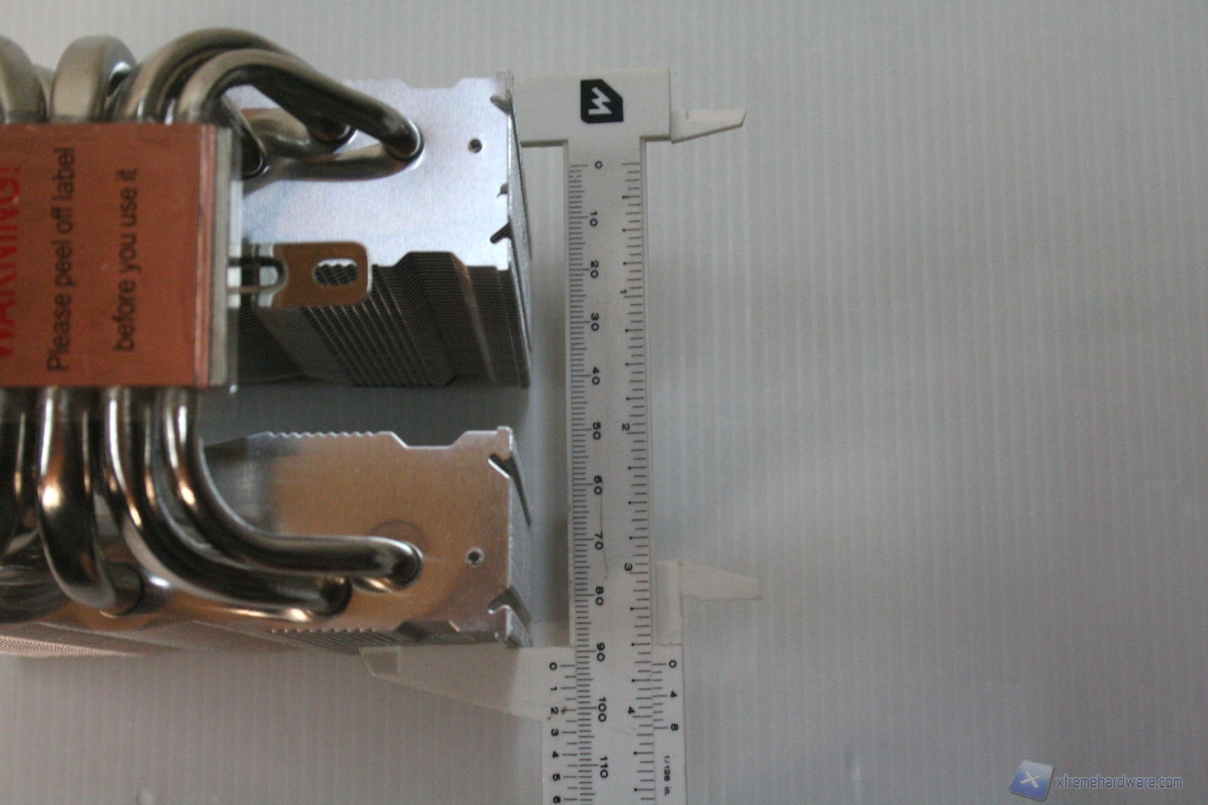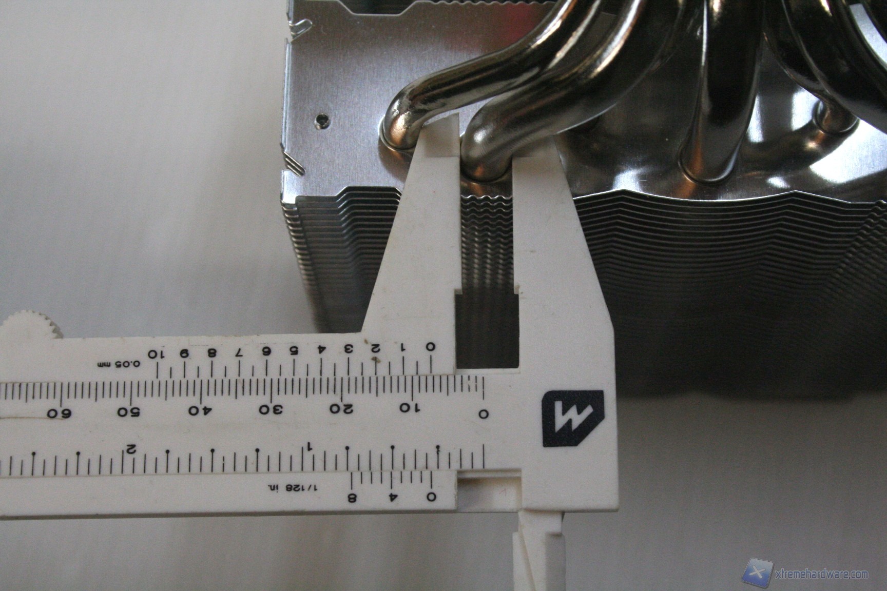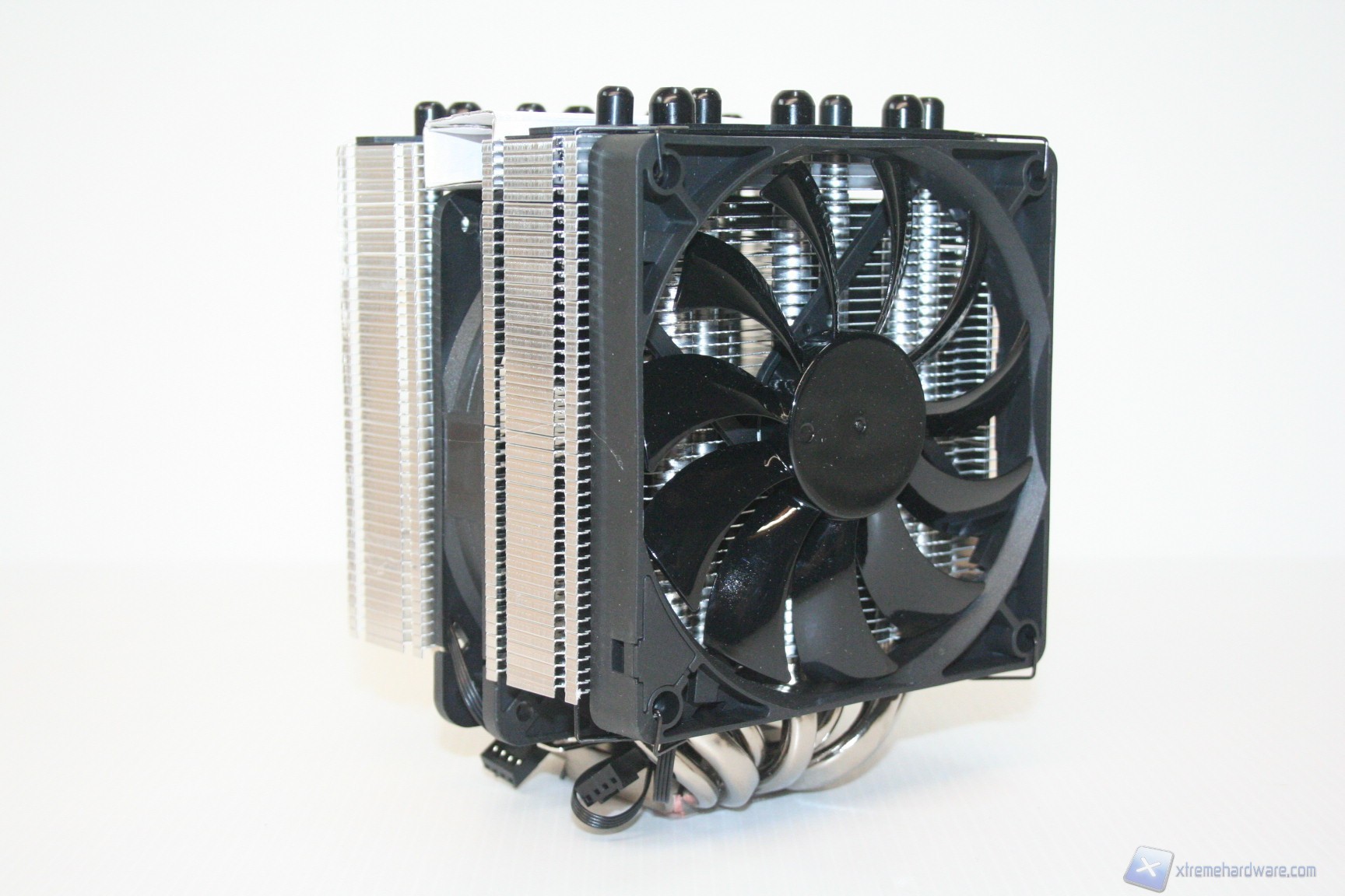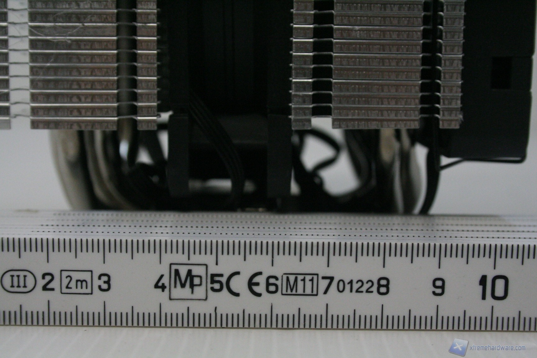 La struttura fa parte della classica tipologia a doppia torre di raffreddamento, costituita da due corpi dissipanti attraversati però da un numero molto elevato di alette, addirittura 7, strutturate a “U” e ottimamente distribuite sull’intero volume. La particolarità di questo modello e della ripartizione delle heatpipes può essere evinta dalla fotografia seguente; precisiamo che è un pattern già visto sul modello, da noi recensito, Gelid GX-7: