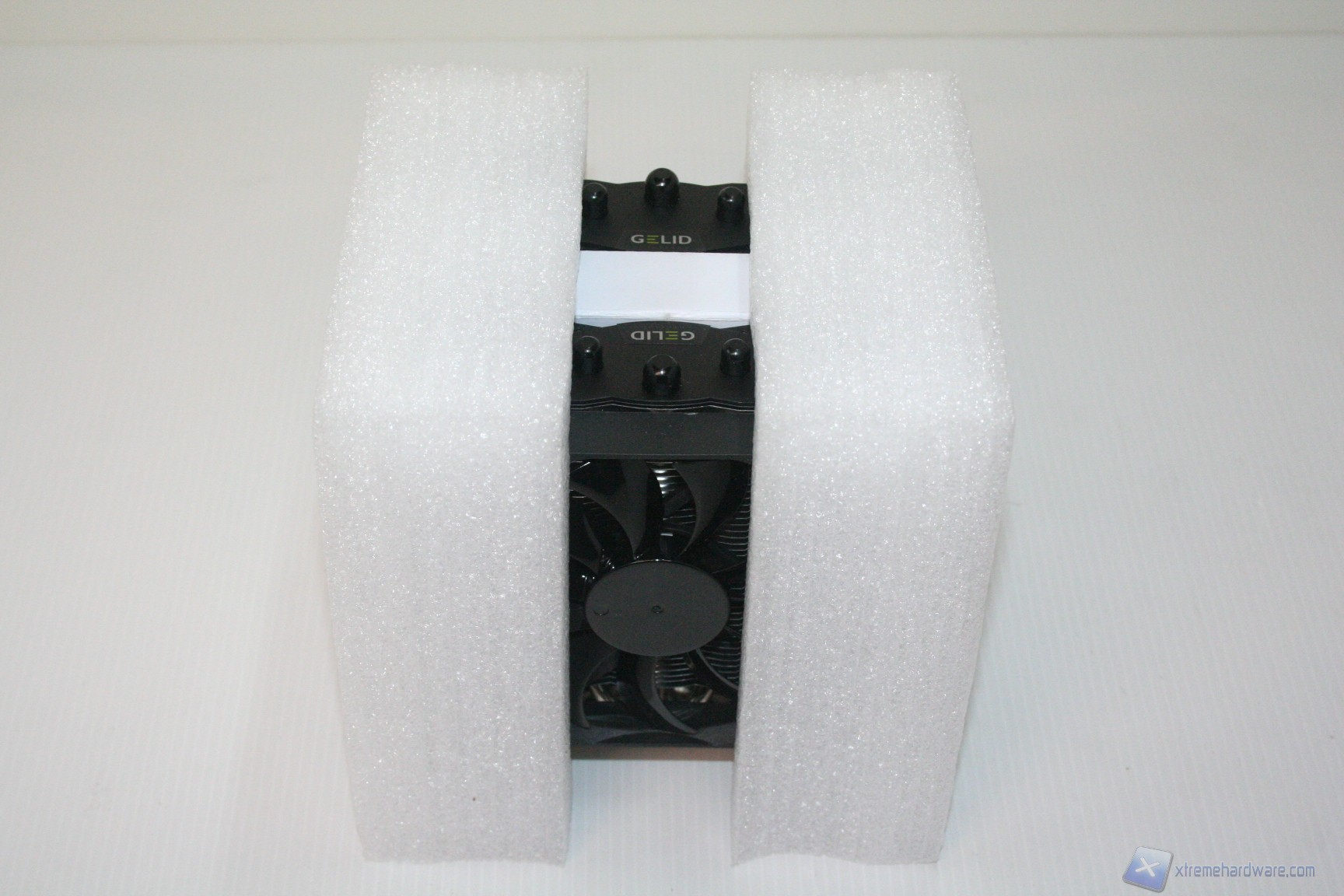 Le 7 heatpipes di diverso diametro sono caratterizzate da un design proprietario Gelid. Le 3 più grandi, da 8mm, consentono lo scambio diretto di calore con il die della CPU. Le 4 più piccole, da 6mm, contribuiscono allo smaltimento di calore delle zone più esterne dell’IHS, e del calore residuo che raccolgono dagli interstizi centrali delle tre heatpipes più grandi. Tale accorgimento permette di massimizzare il contatto lo scambio termico tra la CPU e le numerose heatpipes: infatti, se fossero state posizionate in configurazione allineata, le heatpipes più esterne sarebbero state del tutto inutili.  La struttura del corpo dissipante è discretamente moderna e presenta tutta qualche serie di ottimizzazioni per i flussi d’aria, più precisamente al termine delle alette di raffreddamento, dove troviamo dei profili a onda. Vi mostriamo le fotografie di quella che reputiamo un’ottima stesura della pasta termica, procedete in questo modo.