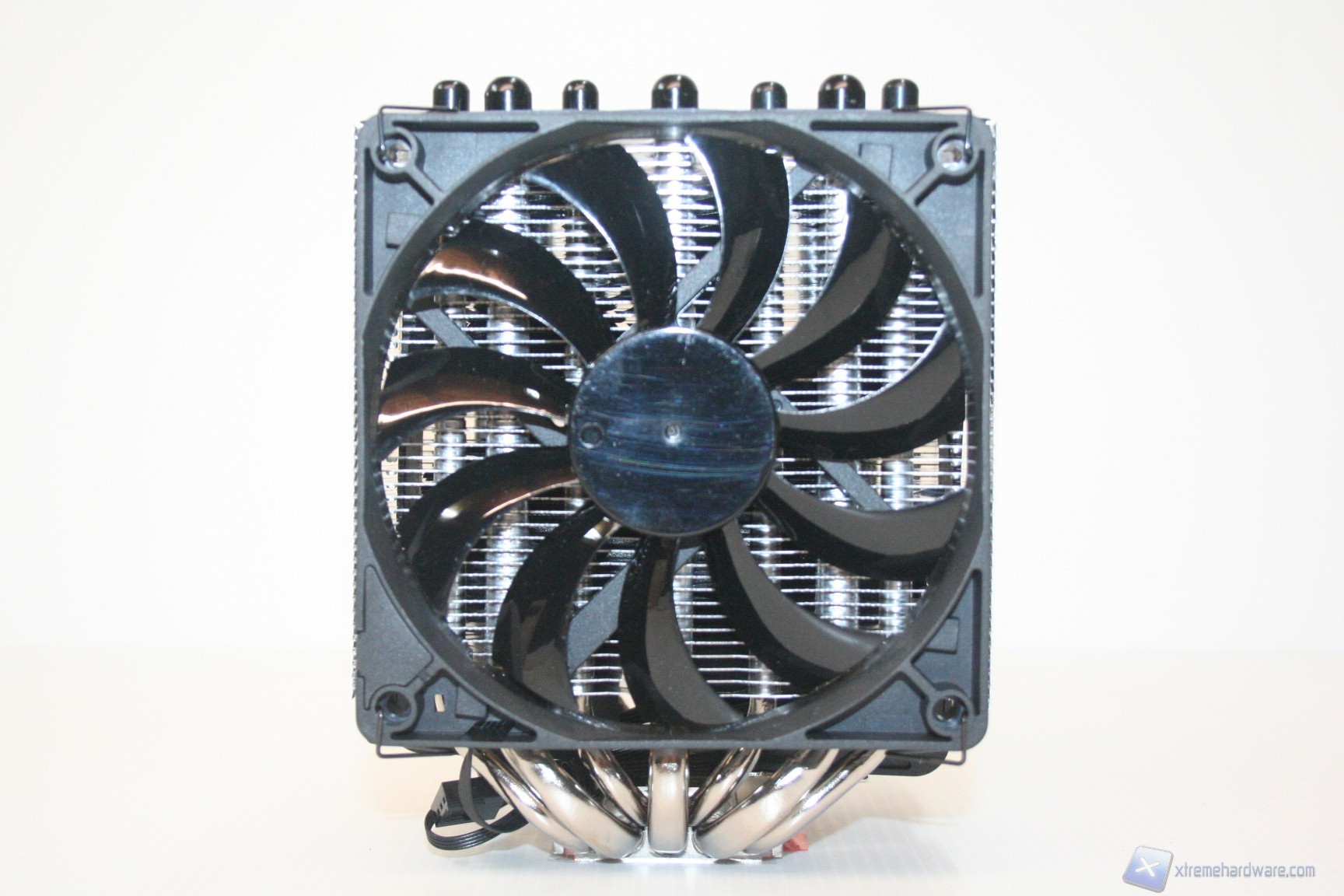 La scudatura finale delle heatpipes è coperta da un cappuccio direttamente sopra le placche di alluminio spazzolato ed è in colorazione nera, che ben contrasta con il resto dell’unità. Presenta una configurazione stock in configurazione P/Pull ed è possibile aggiungere una terza ventola posteriormente, che permetterà un miglioramento marginale della dissipazione termica. La superficie dissipante è medio-elevata e preannunciamo che sarà in grado di gestire CPU particolarmente potenti, quindi risulta un ottimo modello anche per CPU dal basso consumo. La spaziatura leggermente serrata ha permesso di bilanciare le prestazioni complessive con la rumorosità e il peso finale, data la ventola molto potente in dotazione, ammontando a 2.5m
