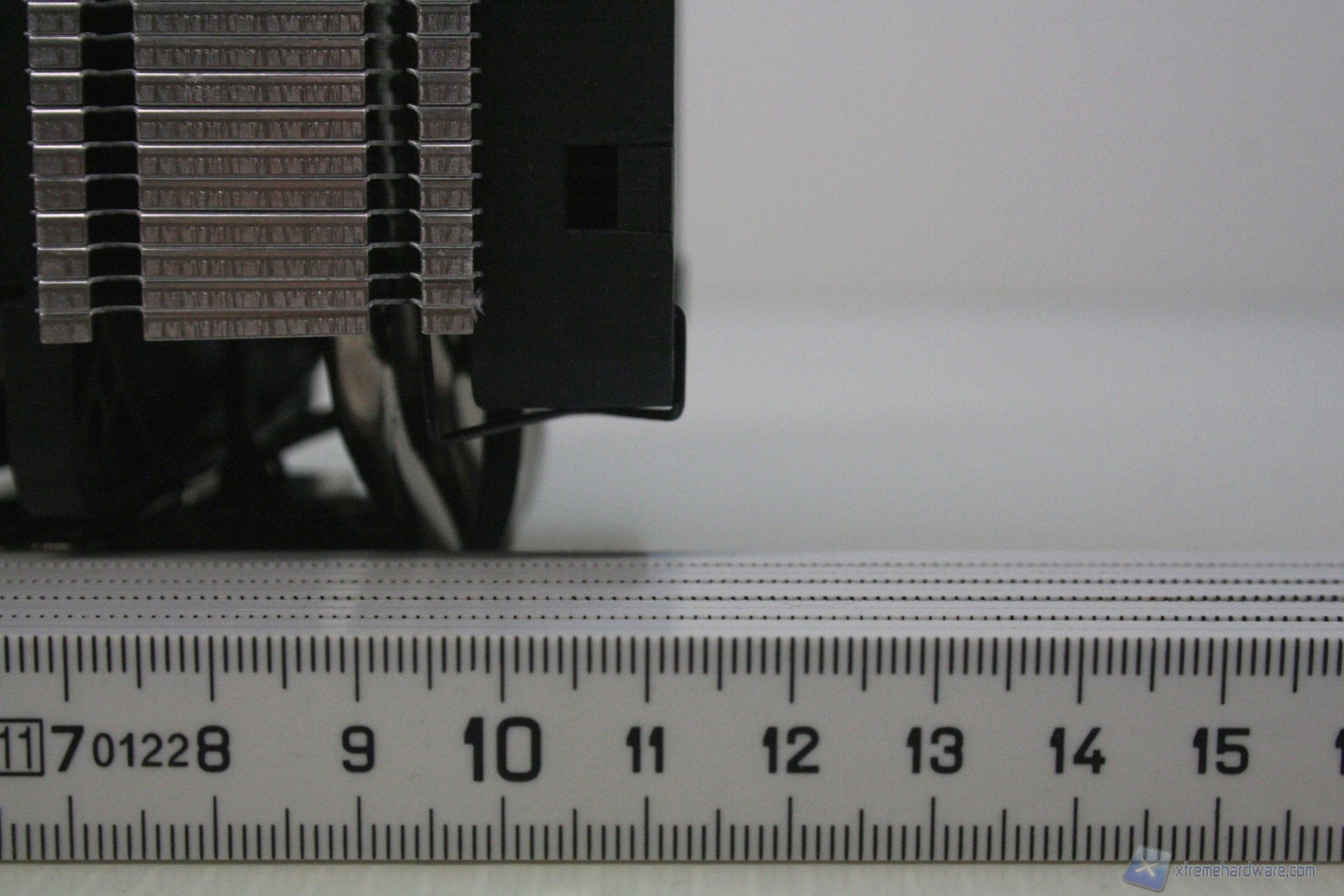 Il corpo dissipante della prima torre è più contenuto rispetto alla precedente, per ragioni di compatibilità con RAM del socket LGA 2011. Al centro non è presente nessun foro orizzontale con rientranze, feature caratteristica di molti altri modelli della concorrenza (metodo utile per migliorare il profilo di ventilazione interno in associazione alla zona morta di ventilazione, derivante dal diametro elevato del motore). La larghezza del dissipatore è relativamente contenuta e non ci sarà nessun problema in fase di installazione.