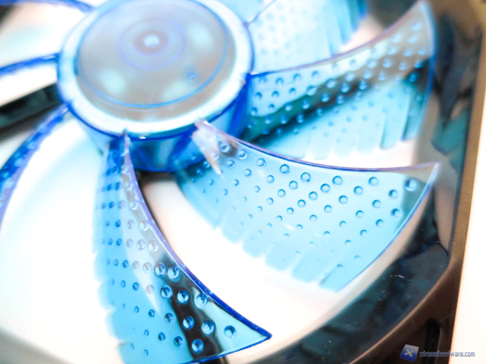 Analizzando nel dettaglio la ventola Coolmove 2 troviamo innanzitutto un design non classico che si caratterizza per una struttura/frame di colore nero che contrasta con le pale di colore azzurro e trasparenti. Le ventole hanno dimensioni standard di 120 x 120 x 25 millimetri di spessore. Siamo sicuri che il vostro occhio si sarà subito focalizzato sulle pale di queste ventole che presentano una struttura non classica. Troviamo 9 pale ed agli estremi di ognuna di esse sono presenti 5 fenditure realizzate per fendere l’aria mantenendo costante la rotazione e massimizzando il flusso. Inoltre notiamo anche dei piccoli rilievi circolari che servono come sempre per una questione aerodinamica, correlata al flusso generato. Le ventole sono dotate di un connettore a 3 pin con relativo cavo rivestito in treccia di tessuto di buona qualità e potranno quindi essere regolate in base alle proprie esigenze tramite un fan controller. Alphacool dichiara per le Coolmove 2 come dati tecnici una rotazione massima di 1300 RPM che garantisce valori di 58,6CFM con una rumorosità di 23 dBA. Prestazioni che le rendono adeguate alla struttura lamellare dell’Eisberg.